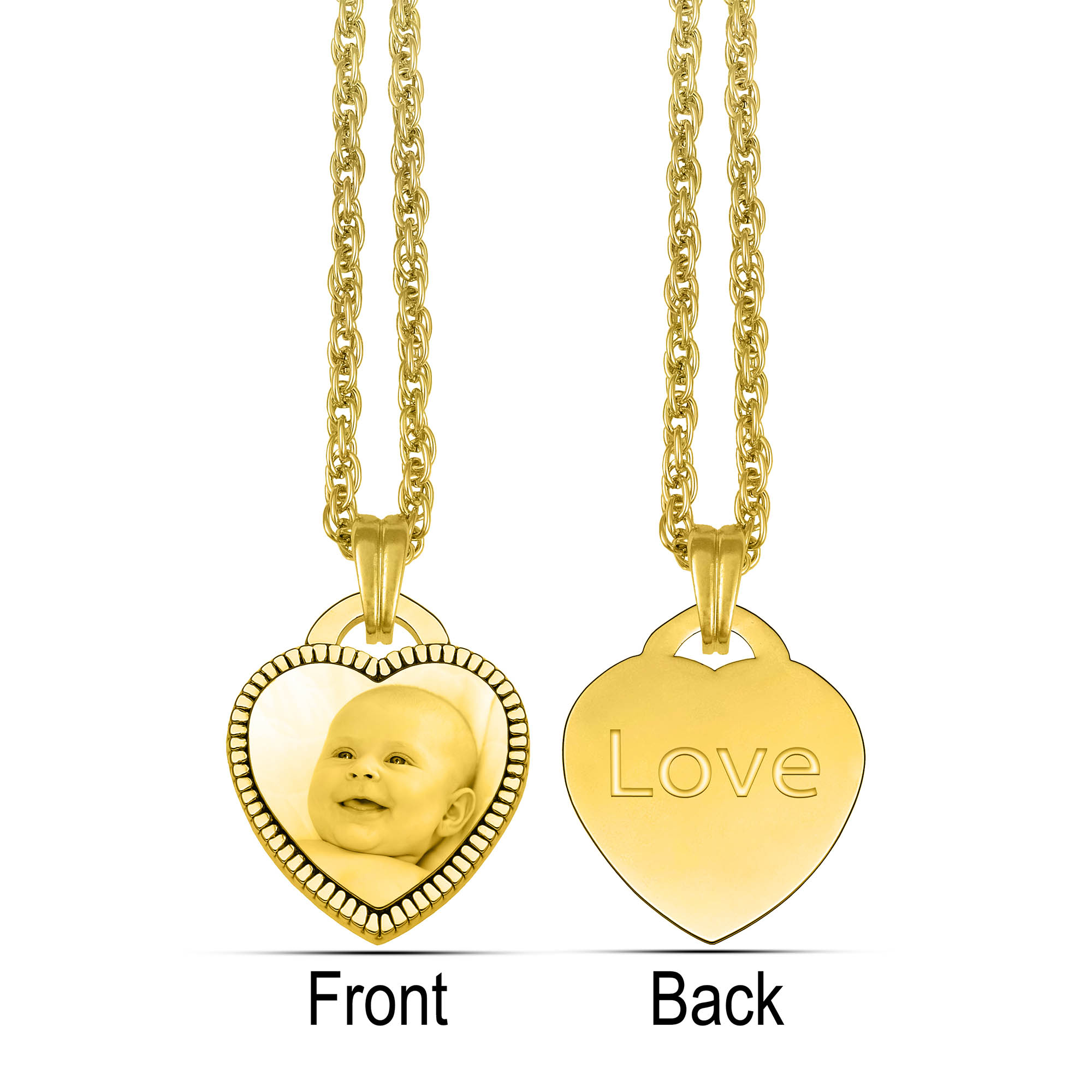 On the pendant engrave your photo or symbol on the front, and engrave (letters / numbers / lines / symbols) on the backside.