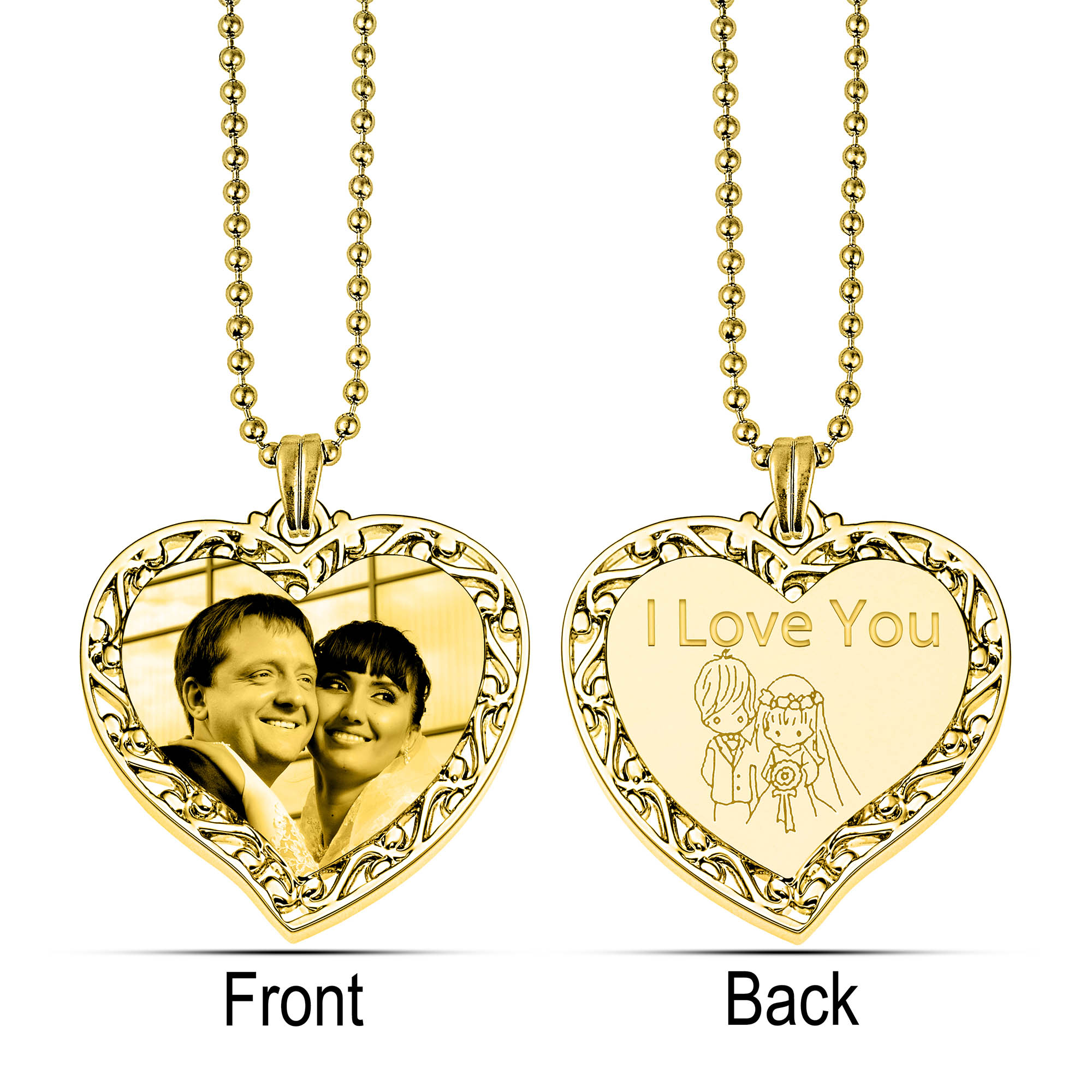 On the pendant engrave your photo or symbol on the front, and engrave (letters / numbers / lines / symbols) on the backside.