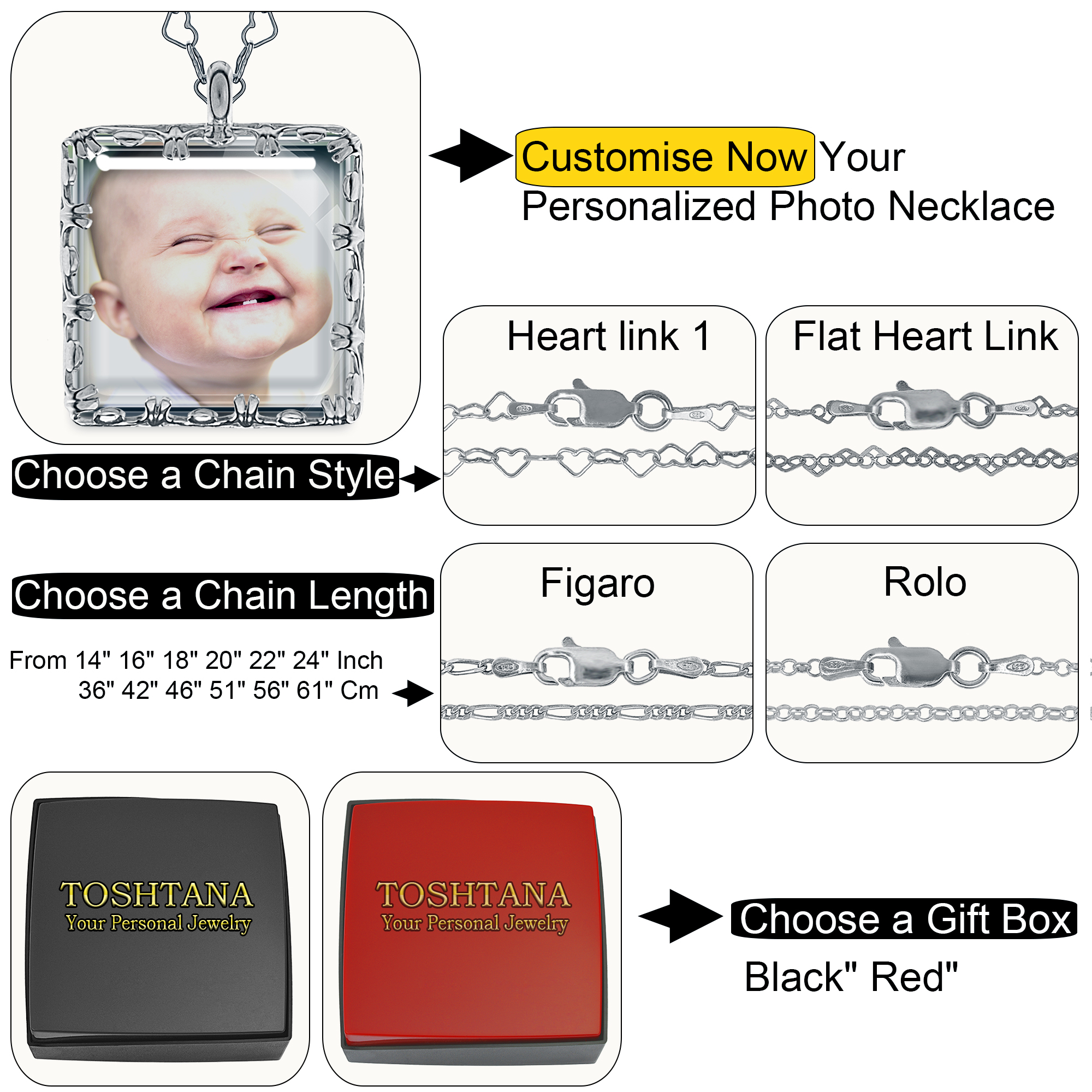 - 👉👉1. Click the ‘Customise Now’ button to begin. 2. Upload your cherished photo for the FRONT SIDE of the pendant. 3. Select your preferred chain style from our options. 4. Choose the perfect chain length that suits your style. 5. Pick your favourite gift box too.
