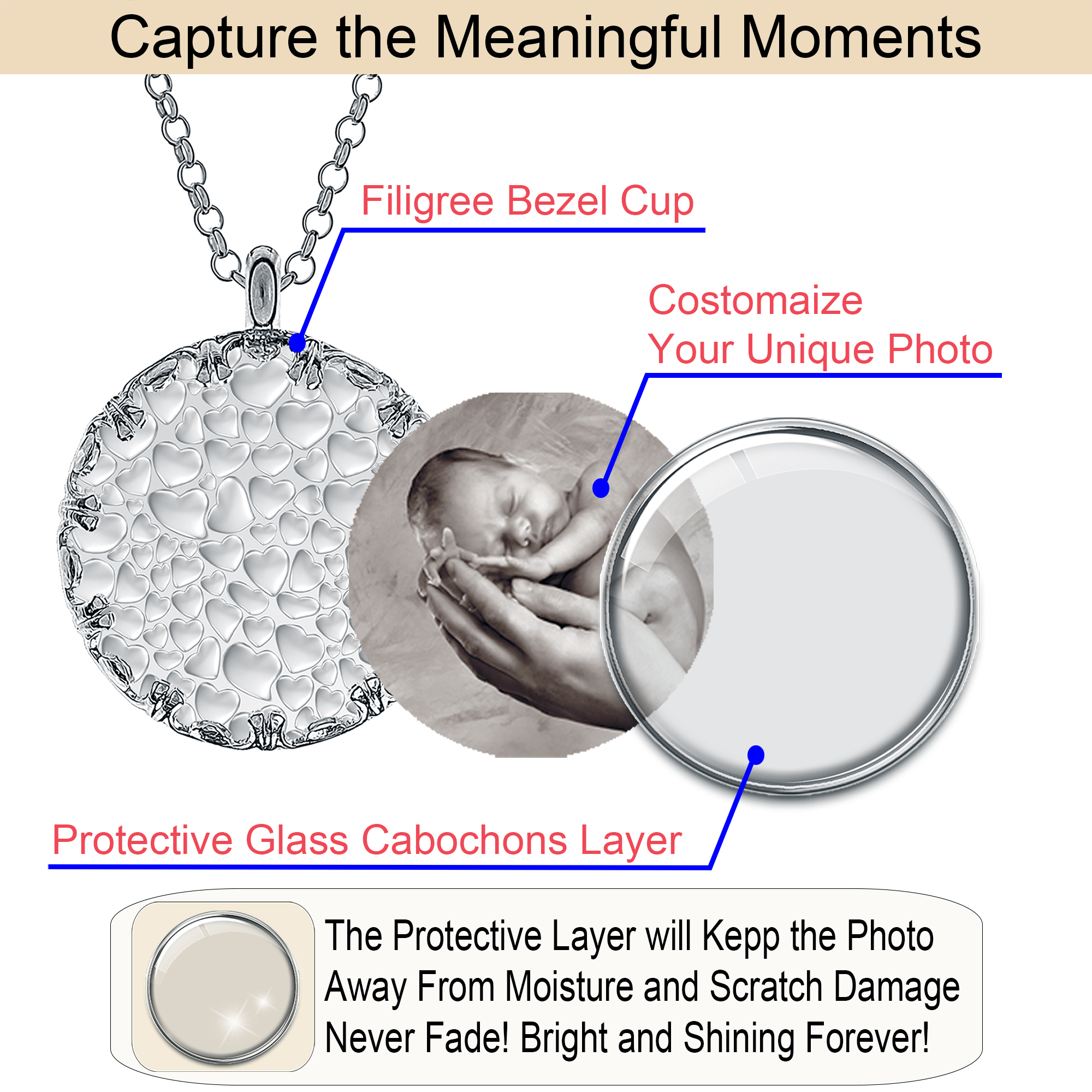 - ⛓️ Versatile Design: Personalised photo necklaces are not just an accessory but a statement piece. Wear it casually or formally; this personalised photo necklace seamlessly complements any outfit.