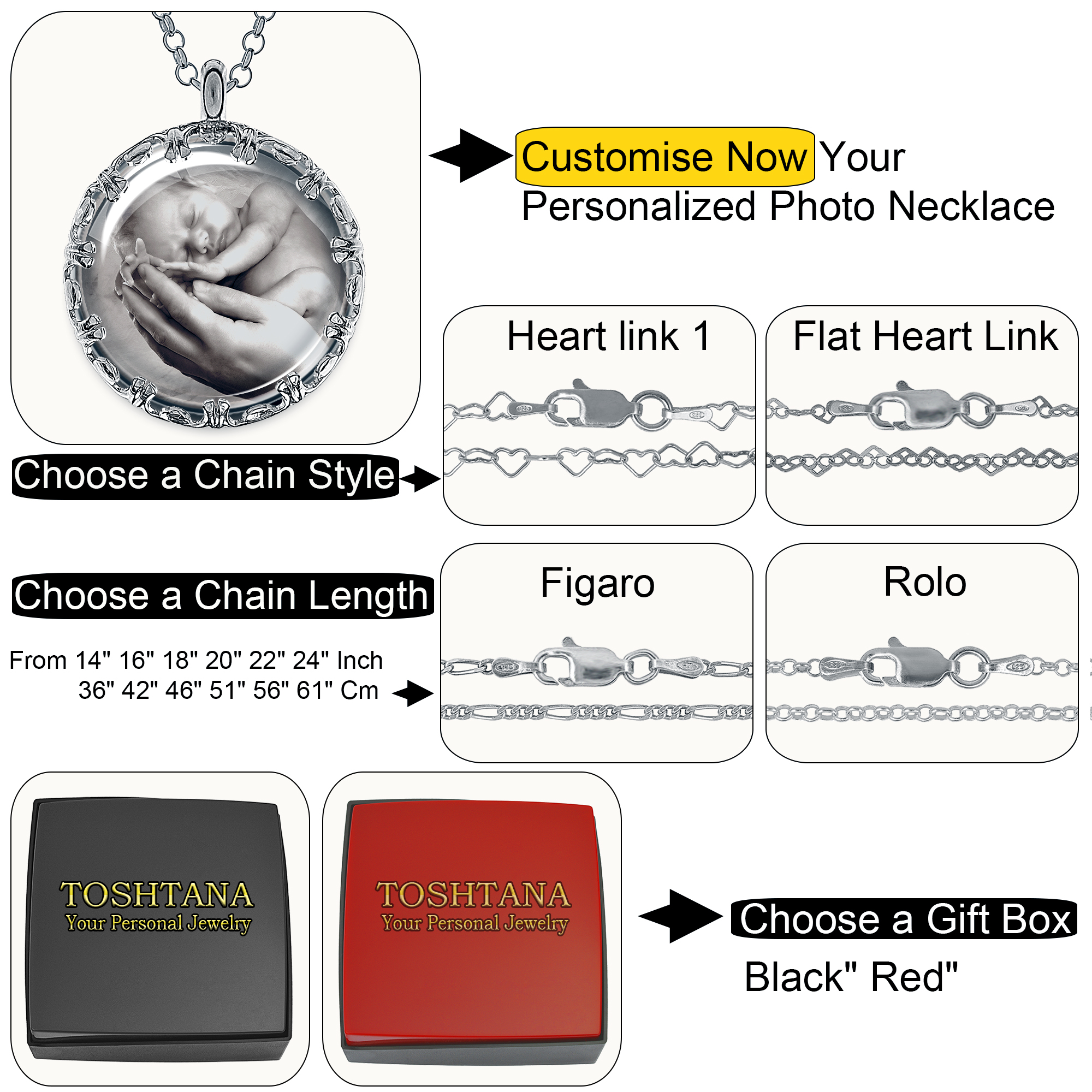- 👉👉1. Click the ‘Customise Now’ button to begin. 2. Upload your cherished photo for the FRONT SIDE of the pendant. 3. Select your preferred chain style from our options. 4. Choose the perfect chain length that suits your style. 5. Pick your favourite gift box too.