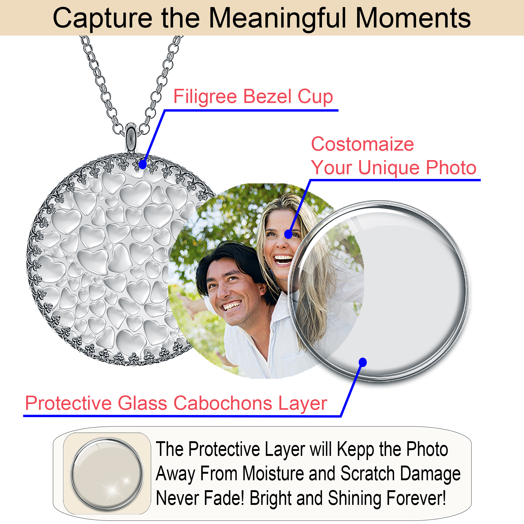 - ⛓️ Versatile Design: Personalised photo necklaces are not just an accessory but a statement piece. Wear it casually or formally; this personalised photo necklace seamlessly complements any outfit.
