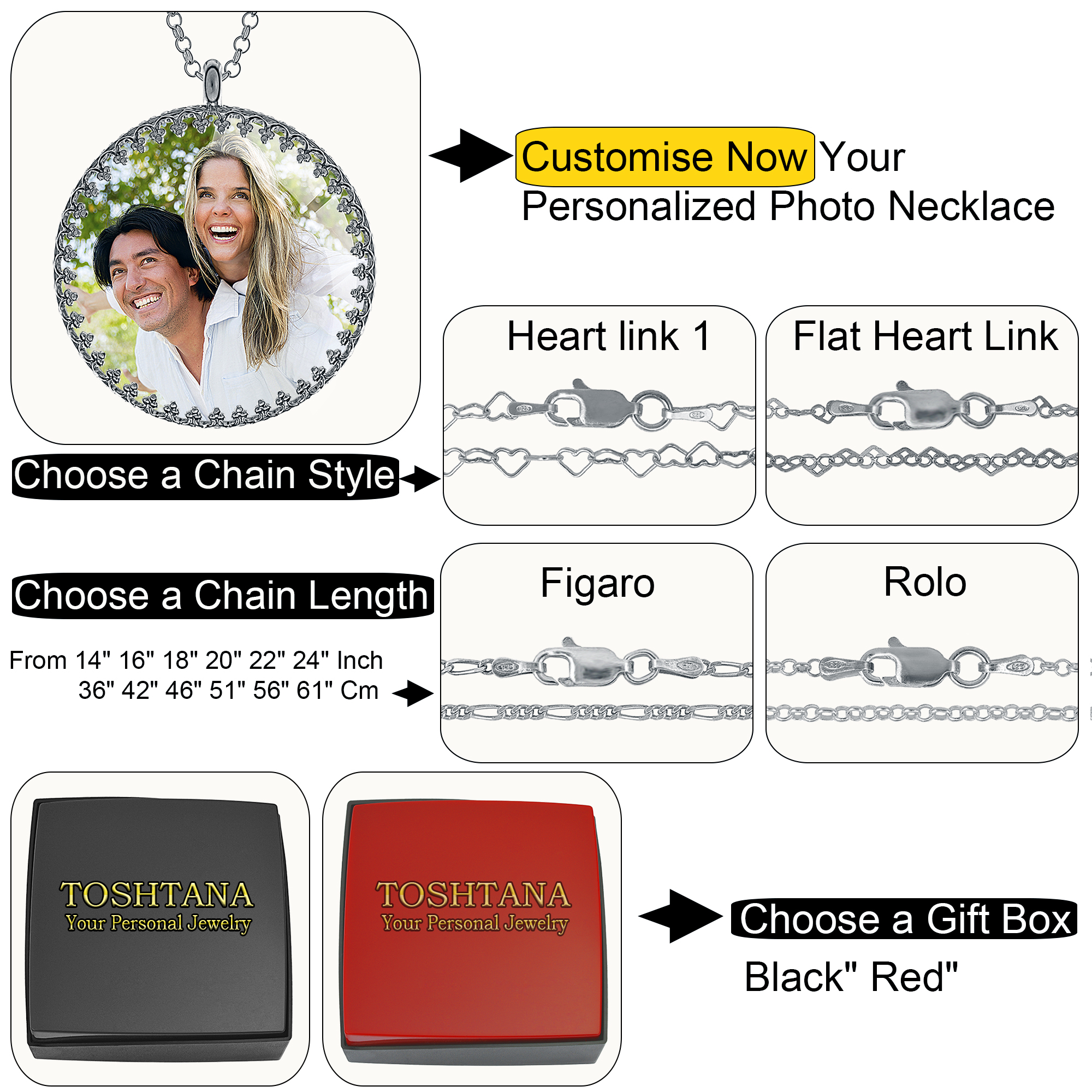 - 👉👉1. Click the ‘Customise Now’ button to begin. 2. Upload your cherished photo for the FRONT SIDE of the pendant. 3. Select your preferred chain style from our options. 4. Choose the perfect chain length that suits your style. 5. Pick your favourite gift box too.