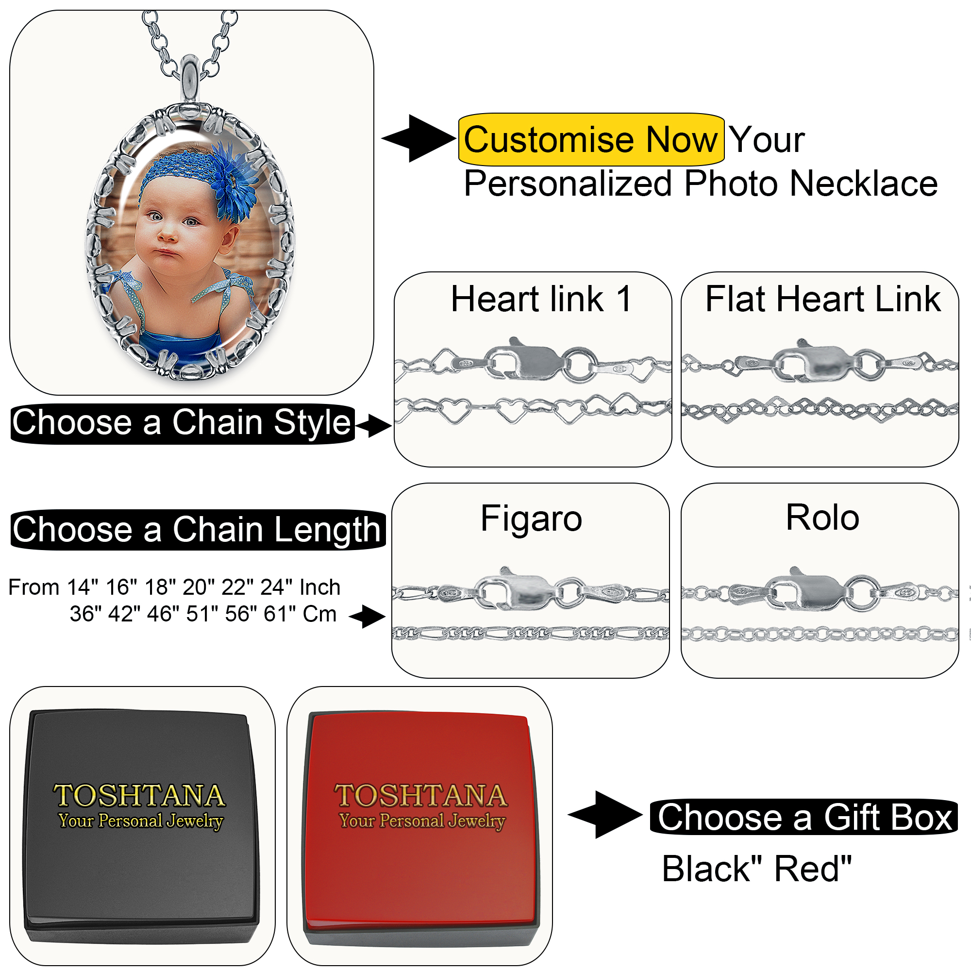 - 👉👉1. Click the ‘Customise Now’ button to begin. 2. Upload your cherished photo for the FRONT SIDE of the pendant. 3. Select your preferred chain style from our options. 4. Choose the perfect chain length that suits your style. 5. Pick your favourite gift box too.
